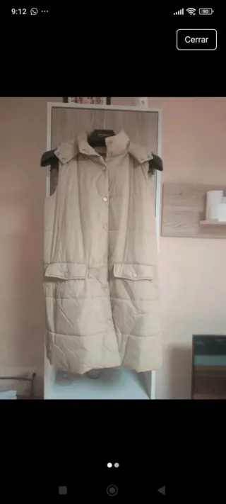 Chaleco largo acolchado, de un precioso y muy de moda color marrón almendra. Cierre con cremallera y bolsillos laterales.