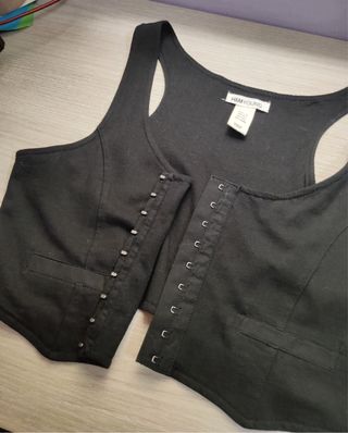 Chaleco corto negro con cierre de corchetes. De H&M young, talla 14A+ (170cm) diría que equivale a una XS-S. Está en perfecto estado, casi sin uso. - Diseño tipo corsé. - Tirantes estilo nadador. Material: 100% algodón.