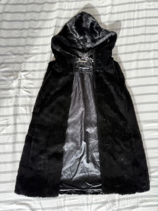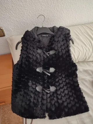 Elegante chaleco de pelo sintético en color negro. Perfecto para añadir un toque de estilo a cualquier conjunto. - Diseño sin mangas. - Cierre de cremallera frontal. - Detalle de cuero en los bajos. Tiene un círculo pequeño sin pelo, pero apenas se ve.