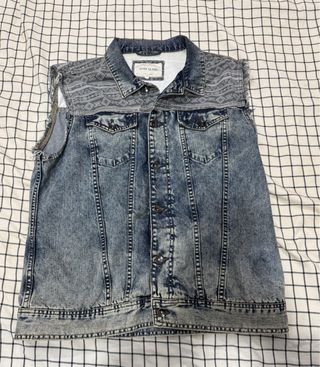 Chaleco vaquero de la marca River Island con un diseño moderno. - Estampado geométrico en la parte superior. - Corte sin mangas. - Cierre de botones. - Bolsillos en el pecho.