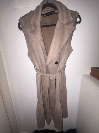 Chaleco largo de ante con cinturón. - Diseño sin mangas. - Cierre cruzado con doble botón. - Cinturón para ajustar a la cintura.