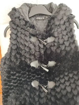 Preciosa chaqueta chaleco de borreguito, color negro, con capucha. Es suavecito y calentito, ideal para los días más frescos. - Diseño con textura de pequeños corazones. - Forro interior acolchado. Talla s. Es gordo. Puesto una vez URGE VENDER por falta de espacio!! NO REBAJO.