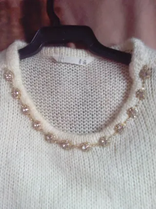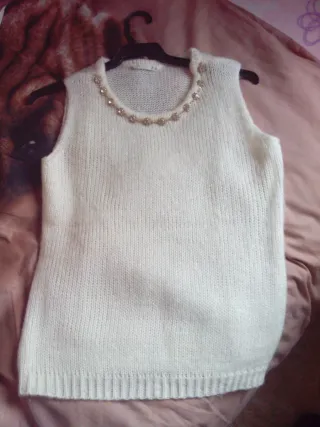 Chaleco de lana de Lefties en color blanco. Un básico para tu armario. - Cuello redondo con detalle de pedrería. - Tejido de punto fino. Talla s. REBAJADO.