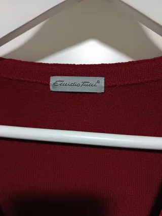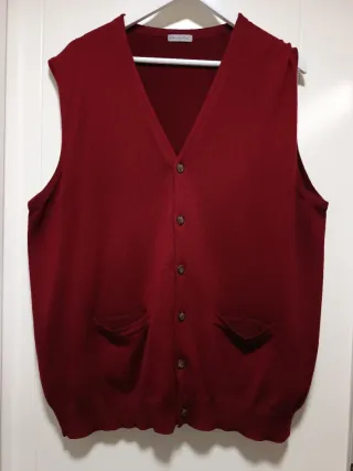 Chaleco de punto de la marca Emidio Tucci en un bonito color burdeos Talla 9. Es una prenda versátil y cómoda. - Diseño de punto con textura. - Cuello en V. - Cierre de botones. - Dos bolsillos delanteros.