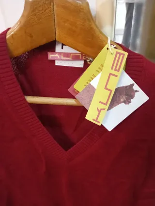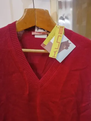 Chaleco nuevo de punto fino de baby alpaca 100% en color rojo. Un básico de armario con un tacto muy suave. - Cuello en pico. - Acabado acanalado en cuello, puños y bajo.