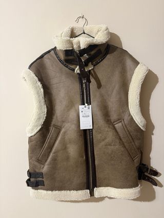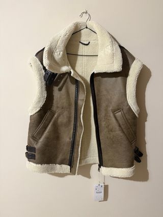 Chaleco con acabado efecto piel y detalles de borreguito. - Cuello alto con cintas. - Cierre de cremallera. - Bolsillos laterales. - Hebillas decorativas en los laterales. Es nuevo, sin estrenar, porque talla grande, para mi gusto equivale a una L.