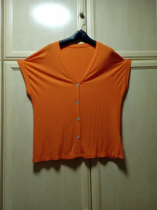 Chaleco de punto fino con botones. - Diseño de canalé. - Cuello en pico. - Manga corta. - Cierre de botones delanteros.