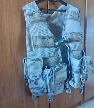 Chaleco táctico de estilo militar con diseño árido y múltiples bolsillos. - Diseño de camuflaje árido. - Malla transpirable en los laterales. - Cierre frontal con cremallera y hebillas. - Varios compartimentos y bolsillos para equipamiento.