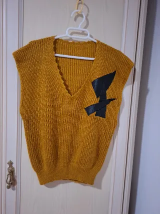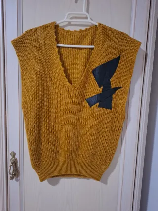 Chaleco de lana tejido a mano con un diseño único. - Color amarillo mostaza. - Detalle de aplique negro en forma de rayo en el pecho. - Cuello en pico.