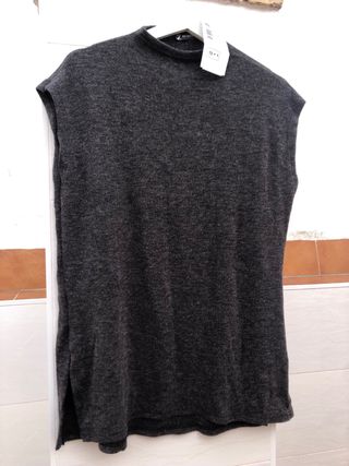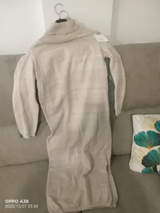 Vestido chaleco de punto fino, ideal para un look elegante y cómodo. - Cuello alto tipo polainas. - Manga larga. - Largo hasta la rodilla. - Tejido suave y ligero. Hay varios vestidos y chalecos nuevos a estrenar pregunten precios