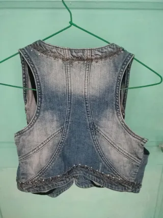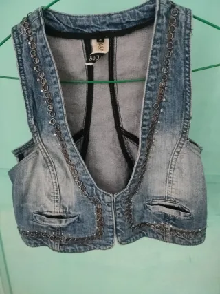 Chaleco vaquero de la marca Inside con un diseño moderno y detalles de tachuelas. - Estilo desgastado. - Adornos metálicos en los bordes. - Bolsillos delanteros. Marca la talla S, es bastante ajustadita, por lo que sirve también para XS
