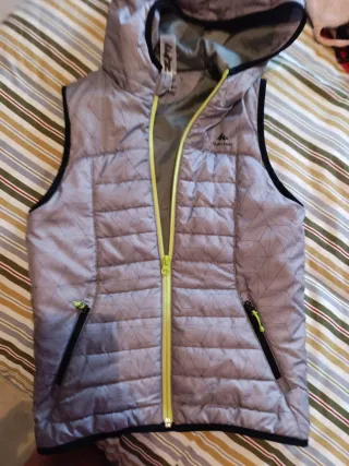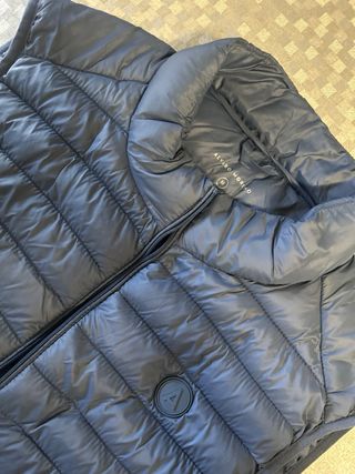 Chaleco acolchado sin mangas con capucha. Muy calentito! Apenas usado. - Diseño bicolor en azul marino y naranja. - Cierre de cremallera frontal. - Dos bolsillos laterales con cremallera. - Detalle de parche circular en el pecho.