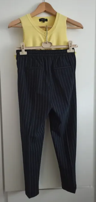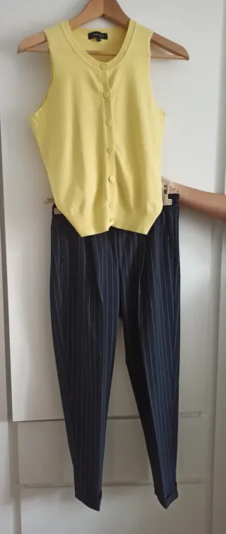 Conjunto de dos piezas para un look moderno y elegante. - Chaleco de punto sin mangas en color amarillo.El chaleco tiene un pequeño desgarro por detrás apenas perceptible (adjunto foto) El chaleco también está sin estrenar - Pantalón de vestir con rayas verticales finas y bolsillos sin estrenar. Talla S