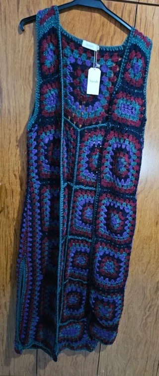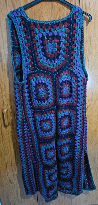 Chaleco largo de crochet con un diseño llamativo y colorido. - Tejido a mano con hilos de calidad. - Diseño de cuadrados tipo granny. - Aberturas laterales para mayor comodidad. - Acabado con borde festoneado en el bajo.