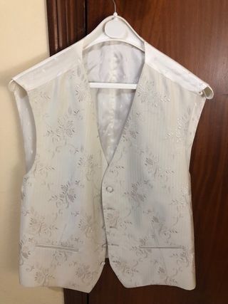 Chaleco de vestir para traje, con un diseño elegante y detalles florales. - Talla 54. - Color blanco y dorado. - Tejido con finas rayas verticales y estampado floral plateado.