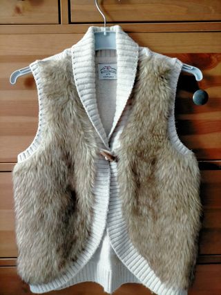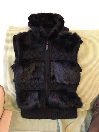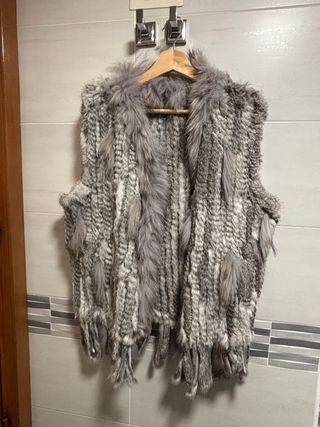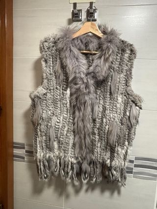 -Elegante chaleco confeccionado con pelo de conejo y zorro. -Pelo natural en tonalidades gris. -Es unitalla, cómodo, suave y calentito -Tiene bolsillos en la parte delantera para las manos -Tiene 2 botones de gancho para cerrar por el medio -Se compró por 90 euros y se vende por 22 euros -En excelentes condiciones, como nuevo, se usó una vez