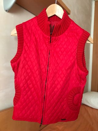 Chaleco acolchado de color rojo con un diseño moderno y detalles de canalé. - Cuello alto de canalé. - Abertura frontal con cremallera. - Mangas sin mangas con borde de canalé. - Bolsillos laterales con detalle de canalé.
