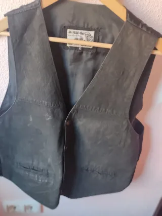 Chaleco de piel marrón de estilo vintage, con forro de raso. - Cierre de botones. - Dos bolsillos delanteros.