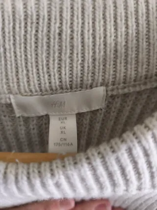 Chaleco largo de punto de la firma H&M talla XL color beige. Presenta unas pequeñas aberturas laterales en los bajos. Mide 48 centímetros de hombro a hombro, 61 cm de sisa y 82 cm de largo en la parte delantera y 89 cm por la trasera. Composición 64% poliéster, 30% acrílico y 6% lana.