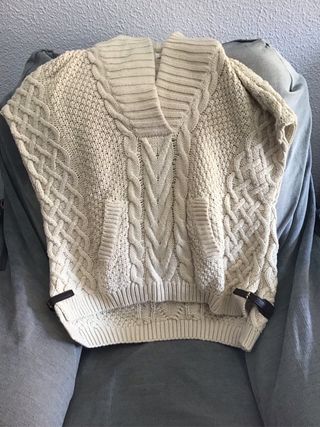 Chaleco de punto grueso con un diseño de trenzas muy llamativo. Es una prenda cómoda y versátil. - Cuello alto con solapa. - Dos bolsillos delanteros. - Detalle de hebilla en los laterales.