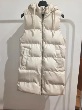 Chaleco largo de polipiel en color crema. Es una prenda versátil y moderna. - Diseño acolchado. - Capucha. - Cierre de cremallera. - Bolsillos laterales.