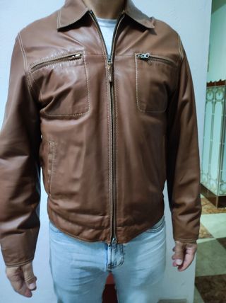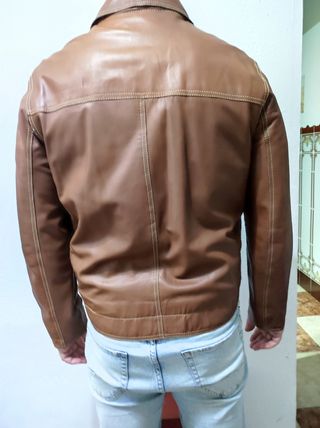 Cazadora piel marron. Es piel 100%. tiene un pequeño arañazo en la espalda y un poco de desgaste en el cuello. como se muestra en las fotos. Reparable.