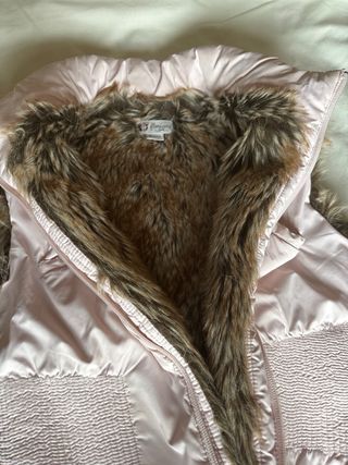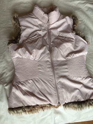 Chaleco rosa muy abrigado, con detalles de pelo en el interior y el bajo. - Cuello alto con textura. - Cierre de cremallera frontal. - Dos bolsillos superiores con solapa. - Cintura elástica fruncida.