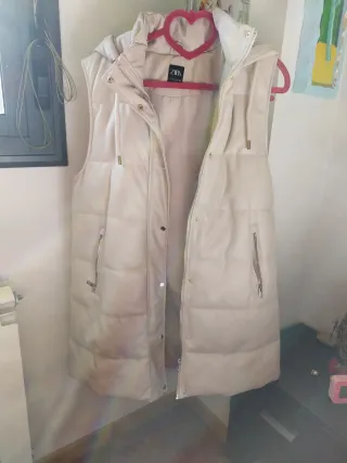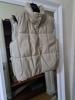 Chaleco de efecto piel en color piedra, de Zara. Un básico versátil para cualquier look. - Diseño acolchado. - Cuello alto. - Cierre de botones a presión. Como nuevo