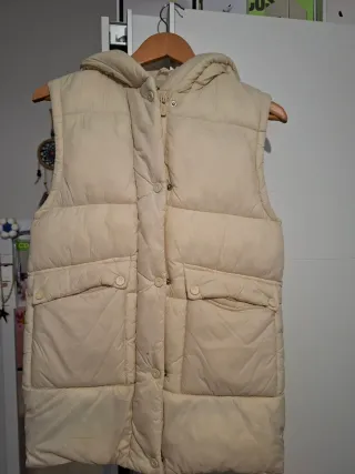 Chaleco largo de color beige con capucha. - Cierre de cremallera frontal. - Dos bolsillos laterales con cremallera. - Capucha ajustable con cordones.