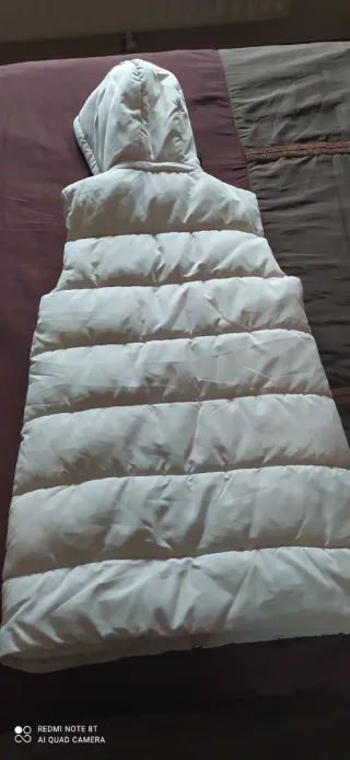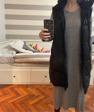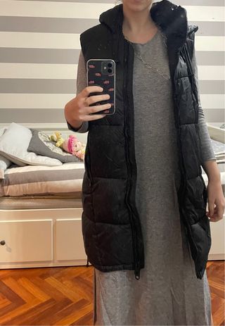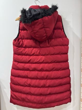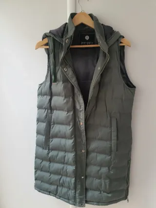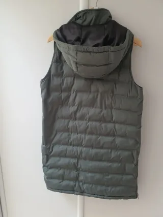 Chaleco acolchado largo con capucha. Prácticamente nuevo - Cierre de cremallera y botones a presión. - Bolsillos laterales. - Cremalleras en los laterales inferiores.