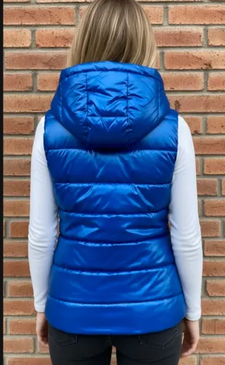 Chaleco con acabado metalizado brillante. Es una prenda ligera y con capucha. Disponible también en azul - Cierre de cremallera frontal. - Bolsillos laterales con cremallera. - Diseño acolchado. En la última foto se ve el color real cuando le da la luz