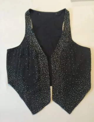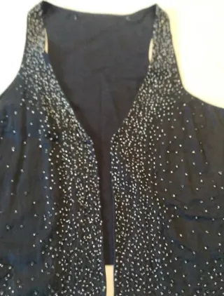 Contorno de cintura 78 cm Largo delante 54 cm Larho detrás 40 cm Elegante chaleco para mujer con un diseño entallado y adornado con abalorios plateados. - Diseño con abalorios plateados. - Corte entallado.