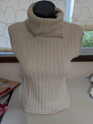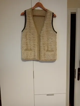 Chaleco de diseño con una combinación de colores. Parte superior con estampado de "rombos" en negro y plata. Cuerpo principal en tejido tweed color crema con finas líneas negras. Tela gordita, ideal para poner sobre una camiseta básica negra. Da bastante talla. Sólo desabotona el botón de la parte oscura, el resto son de adorno y no abren. En la parte negra es donde tiene los destellos brillantes. Los bolsillos son de adorno. Muy poco uso.