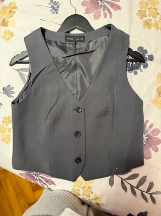Chaleco punto Stradivarius en color gris. Cuello pico. Pequeña apertura en laterales. Talla XS. Medidas: Sisa 50cms. / Largo:60cms. En perfecto estado. Más ropa, calzado y complementos en mi perfil. VISÍTALO!!!DESCUENTO SI COMPRAS MÁS DE UN ARTÍCULO DE MI PERFIL!!!