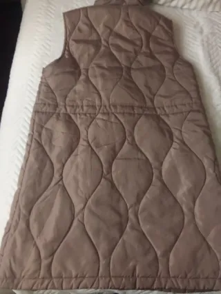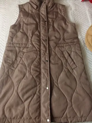 Chaleco acolchado de color marrón. Es una prenda versátil y cómoda. - Cuello alto. - Cierre de botones a presión. - Bolsillos laterales. - Forro interior a cuadros. talla ligeramente pequeño, para mí como una 38