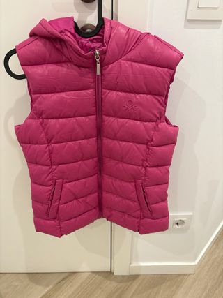 Chaleco acolchado para niña talla 11-12. - Cierre de cremallera. - Cuello alto. - Bolsillos laterales. - Pequeño detalle de corazón en el pecho. - Capucha oculta.