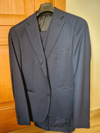 Se vende traje de novio de la marca Enzo Romano. Color azul brillante. Compuesto por chaqueta (talla 54), pantalón (talla 50), chaleco (talla 52) y corbatín. Se ha utilizado en una sola ocasión y después se llevó a tintorería. Esta como nuevo.