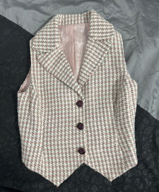 Chaleco de vestir ideal para ir a El Rocío, ferias flamencas y demás, con un diseño a cuadros en tonos beige, gris y rosa. Ideal para combinar con camisas. - Cuello solapa. - Cierre de botones. - Corte entallado -Chaleco hecho a medida talla una S -NUNCA LO HE USADO, me lo hice para ir a El Rocío y nunca lo estrené