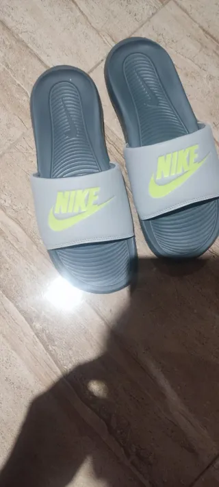 Chanclas Nike con un diseño moderno y cómodo. - Banda superior gris con logo Nike en verde neón. - Suela gris con textura. - Diseño abierto tipo pala.