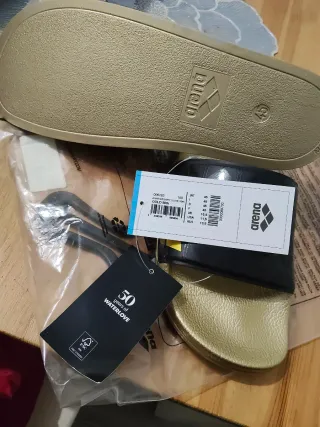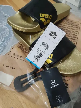 Chanclas de la marca Arena, edición especial 50 years of waterlove. - Diseño en dorado y negro. - Talla 45. - Suela con logo de la marca.