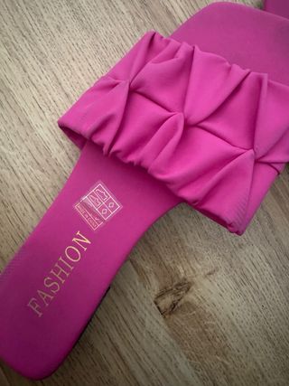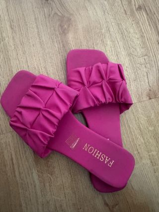 Chanclas de vestir en color fucsia con un diseño moderno y llamativo. - Tira superior con detalle fruncido. - Punta cuadrada. - Suela con detalle de la palabra FASHION.
