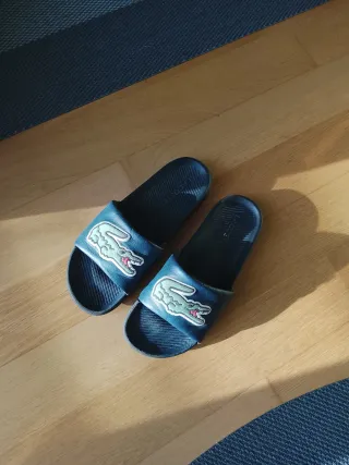 Chanclas de la marca Lacoste con el icónico cocodrilo. - Diseño en color azul. - Detalle del cocodrilo en color verde.