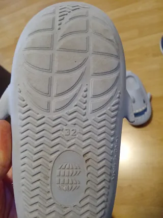 Talla aproximada. La suela tiene unos 27,5 cm de largo la parte que contacta con el suelo y la parte para el pie es de unos 25 cm. El ancho es de unos 9 cm. Tiene sistema de cierre con velcro por el tobillo con un hueco aproximado de unos 8 cm y con hebilla de plástico en la parte delantera. La hebilla tiene dos orificios y el velcro funciona perfectamente. La suela tiene unos 2cm de grosor y es bastante dura. La suela está en buen estado, la parte que contacta con el suelo tiene un desgaste apropiado del uso y la del pie derecho tiene un corte en su parte interior como se ve en las últimas fotos. Se ha añadido pegamento al corte.