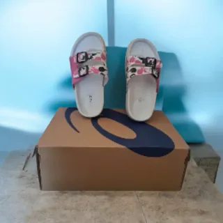 Chanclas de mujer con un diseño moderno y llamativo. - Tira doble ajustable con hebillas. - Estampado floral en rosa y negro sobre fondo blanco. - Suela blanca. - Talla M.