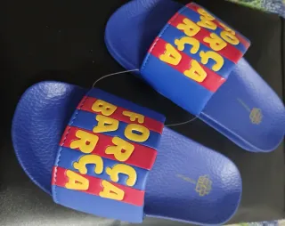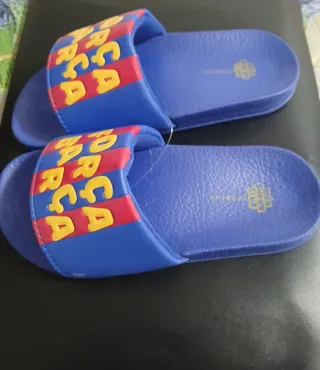 Chanclas con el diseño del FC Barcelona. - Tira con los colores azul y rojo. - Logo del equipo en la tira.