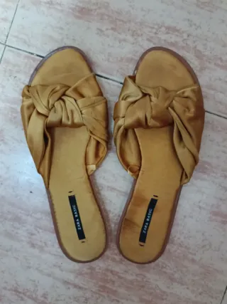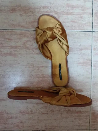 Elegantes chanclas planas en color dorado, perfectas para complementar tu look. - Diseño con tiras trenzadas. - Usadas solo una vez.