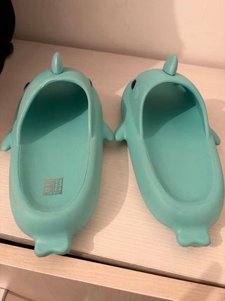 Divertidas chanclas con diseño de tiburón. Utilizadas una vez, equivocación de talla. - Color: Teal. - Diseño divertido con dientes y aleta. - Material cómodo para el uso diario.