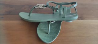Vendo un par de chanclas Ipanema. Son de color marrón oscuro y morado, con un diseño floral y tiras en dorado. Están en perfecto estado, apenas usadas. - Diseño floral elegante. - Cómodas y ligeras. - Perfectas para el verano.