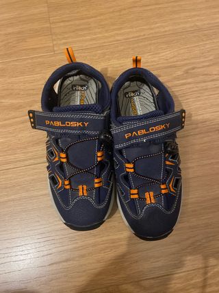 Sandalias deportivas Pablosky en color azul y naranja. - Cierre de velcro. - Suela de goma. - Detalle de cordones elásticos.