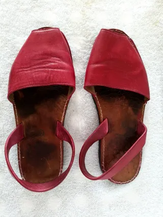 Porqueras menorquinas. Usadas, pero en buen estado, sin defectos. Suela poco desgastada. Color rojo fresa.